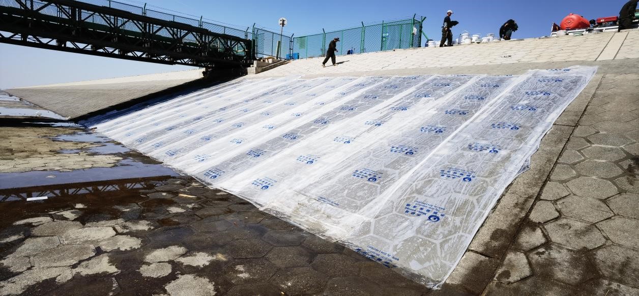 混凝土節(jié)水保濕養(yǎng)護(hù)膜,是以新型可控高分子吸水材料為核心,以塑料薄膜為載體,通過(guò)設(shè)備加工復(fù)合而成的卷材產(chǎn)品。其中高分子材料可吸收自重200倍的水分子, 吸水膨脹后變成透明的晶狀體,把液態(tài)水變成固態(tài)水,每平方米養(yǎng)護(hù)膜可蓄水0.5KG,成為一個(gè)固態(tài)的微型水庫(kù),然后通過(guò)毛細(xì)管的作用向混凝土養(yǎng)護(hù)面滲透, 同時(shí)不斷吸收混凝土在水化過(guò)程中產(chǎn)生的蒸發(fā)水,因此在一個(gè)養(yǎng)護(hù)期內(nèi)總能保持混凝土表面濕潤(rùn)。